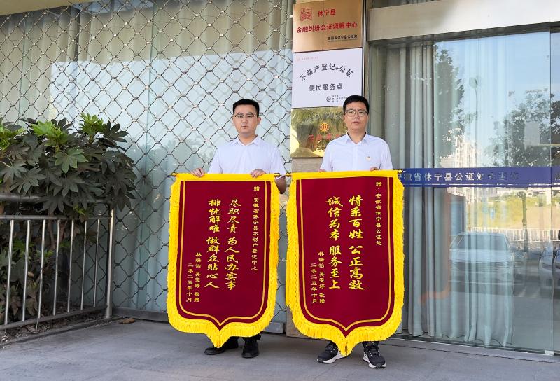 “只跑了一次,在家就能拿到不动产权证,真是太感谢你们了!”近日,身在上海的申请人林女士、吴女士领到了不动产权证,还分别向休宁县不动产登记中心和公证处送上锦旗,道出了她们对跨部门便民服务的真挚认可。