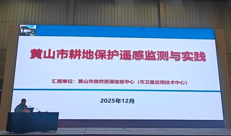 根据会议安排,黄山市卫星应用技术中心作为市级代表,以“黄山市耕地保护遥感监测与实践”为主题汇报了具体做法。黄山市自2023年起系统开展耕地保护遥感监测试点工作,聚焦耕地“非农化”“非粮化”监测预警核心需求,构建了“天上看、地上查、网上管”的空天地一体化监测监管闭环,显著提升了耕地保护工作的智能化、精准化与时效性,为市级卫星中心建设与服务模式探索了有效路径。目前,试点任务已圆满完成,取得了一系列实质性成果与宝贵经验,并先后荣获中国遥感协会第二届高分卫星应用优秀成果一等奖、2024年“数据要素×”大赛安徽分赛空天信息赛道铜奖及优秀奖。