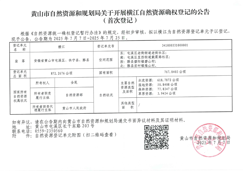 黄山市自然资源和规划局关于开展横江自然资源确权登记的公告(首次登记)