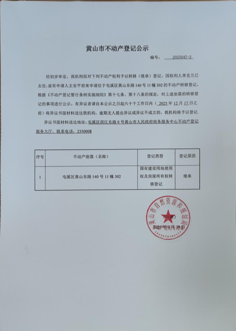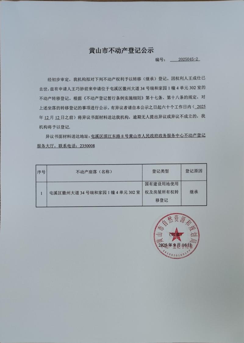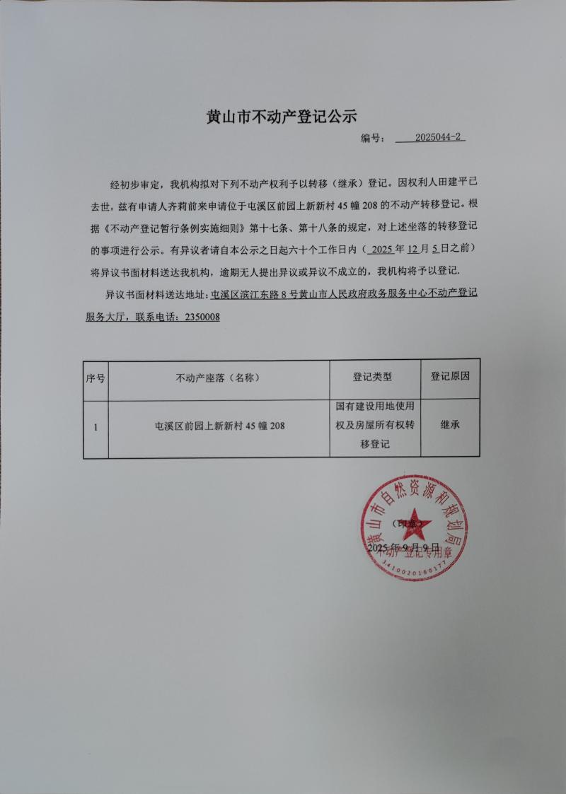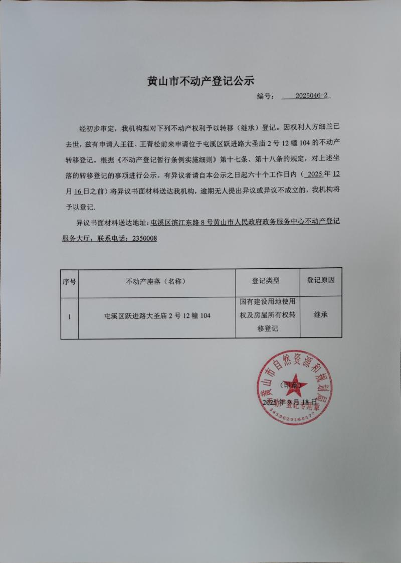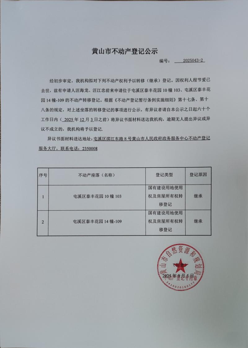 黄山市不动产登记公示(2025043-2、2025044-2、2025045-2、2025046-2、2025047-2)