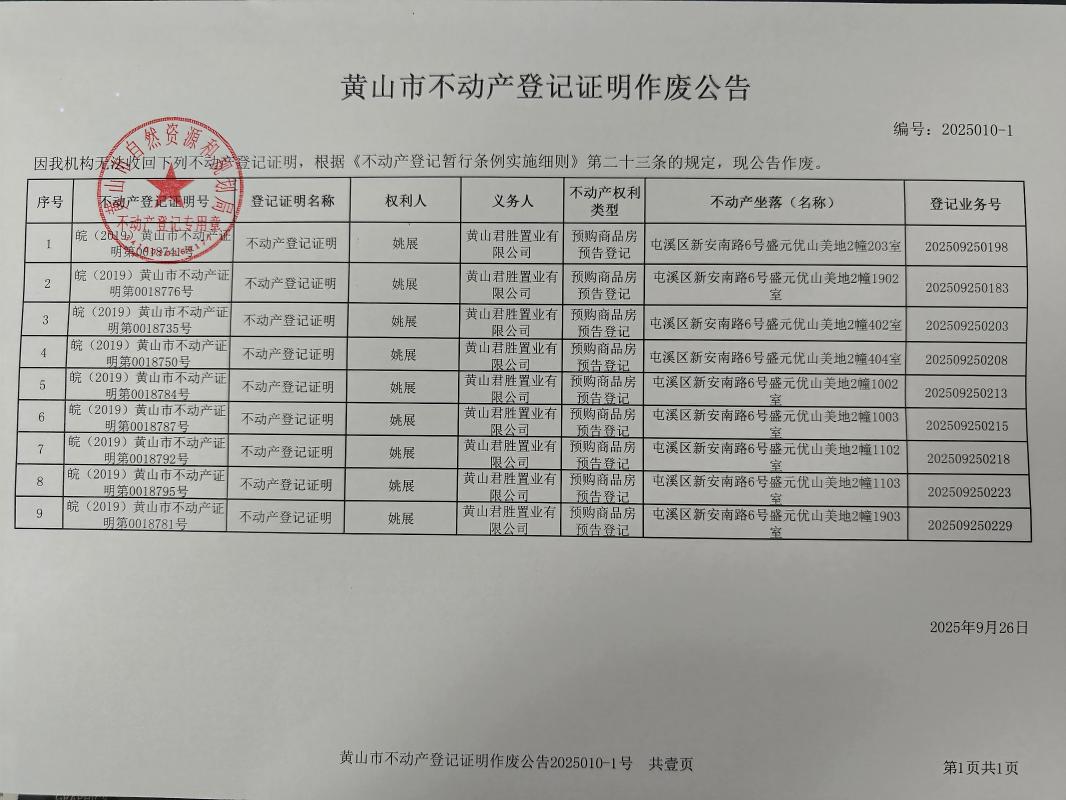 黄山市不动产登记证明作废公告2025010-1