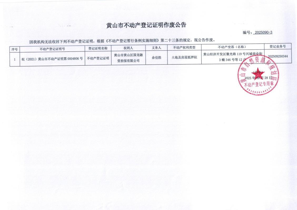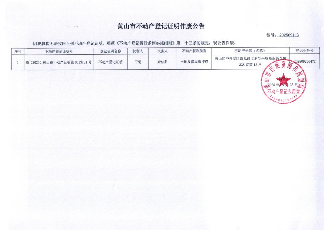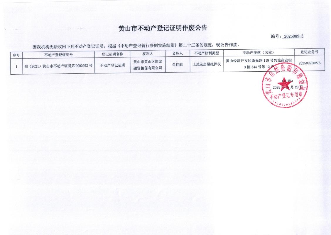 黄山市不动产登记证明作废公告(2025089-3、2025090-3、2025091-3)