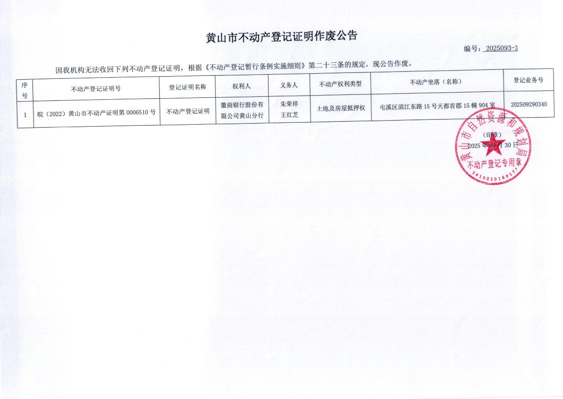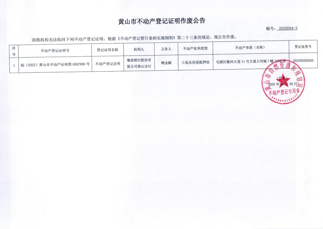 黄山市不动产登记证明作废公告(2025092-3、2025093-3、2025094-3)