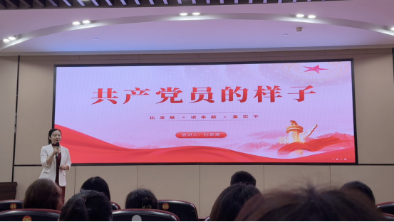 宣讲中,杜家昊以“共产党员的样子”为主题,紧扣《习近平谈治国理政》第五卷中关于“中国共产党是人民的党,是为人民服务的党”等重要论述,结合生动案例诠释共产党员本色。她既回顾历史,讲述了抗战时期“娃娃兵”英勇无畏、雷锋同志无私奉献的感人事迹;又立足当下,分享了黄山李培生、胡晓春长年坚守山巅、守护迎客松的先进事迹。同时,结合不动产登记工作实际,介绍了市不动产登记中心在“春节不打烊”值班值守、全省率先推出线上见证服务、创新升级政银直连模式等方面的积极探索,使“徽易登”党建品牌更加贴近群众需求,生动展现了基层党员“立足登记窗口小岗位,做好服务群众大文章”的实干与担当。