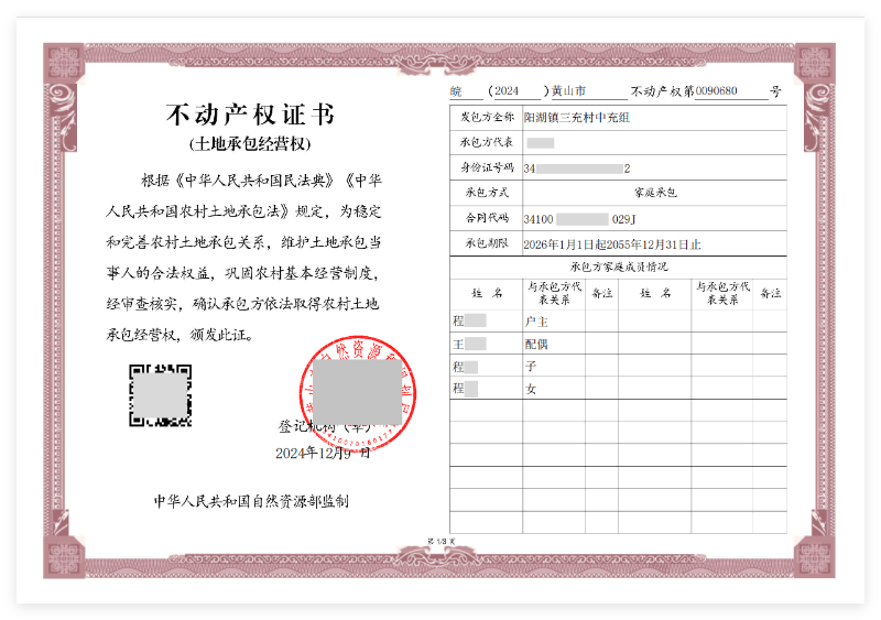 安徽首本新版土地承包经营权不动产电子证照在黄山市颁发